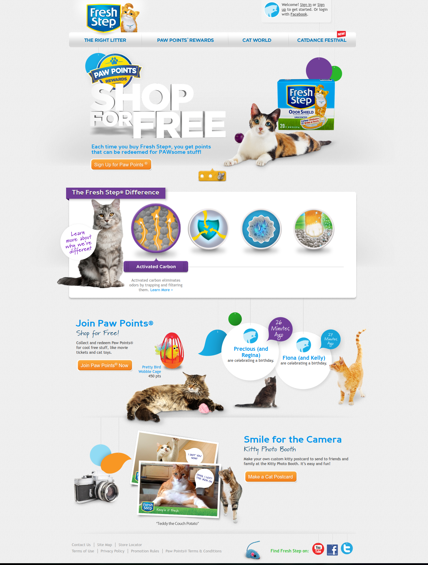 Another large project that launched in 2012 for Clorox was the Fresh Step site, which involved standing up a completely new site for the brand of kitty litter with an ambitious design with many social aspects. It launched with a loyalty program managed by ePrize, integrated via an XML-based API. Consumers entered unique codes printed on packaging in exchange for a virtual currency. The “paw points” could be spent on coupons and cat-themed items such as toys.